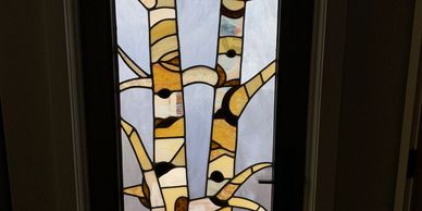 We cut and fit each piece according to the design on the paper under the work. Then add in the caming in between the pieces of glass. When its all done, you are good to solder all the connection spots and do the finishing patina.
